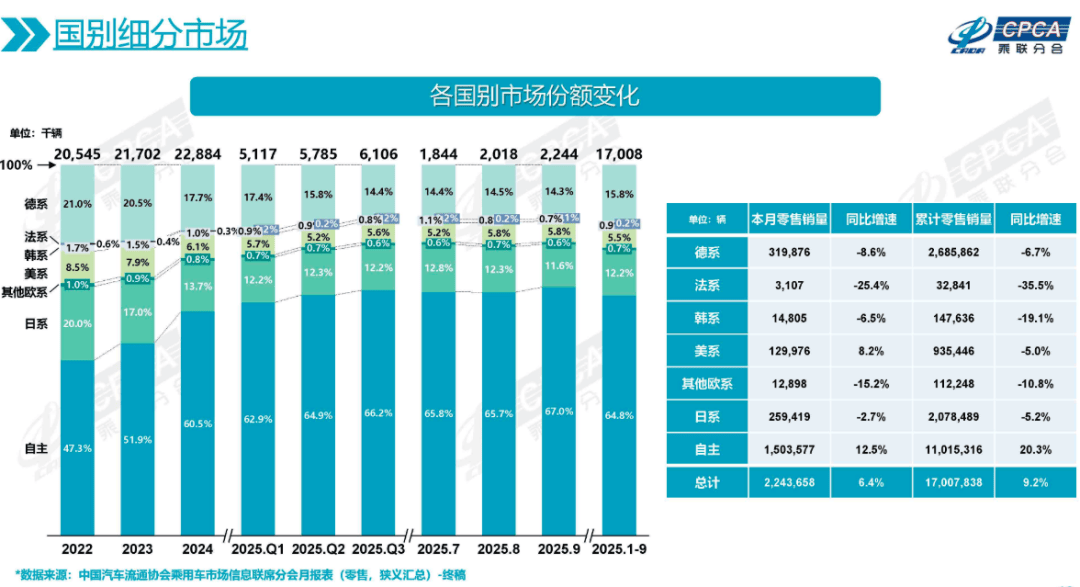 2025年1月至9月,德系品牌在中國(guó)市場(chǎng)的新車銷量占比為15.8%,較去年同期下滑6.7個(gè)百分點(diǎn)。