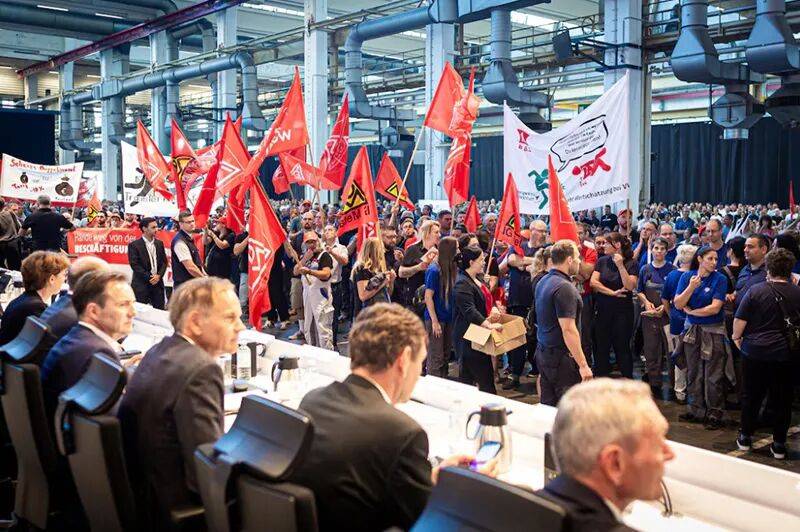 首次傳出將關(guān)閉本土工廠消息后,大眾汽車在總部舉行員工大會(huì),工人們手舉標(biāo)語抗議。圖片來自路透社