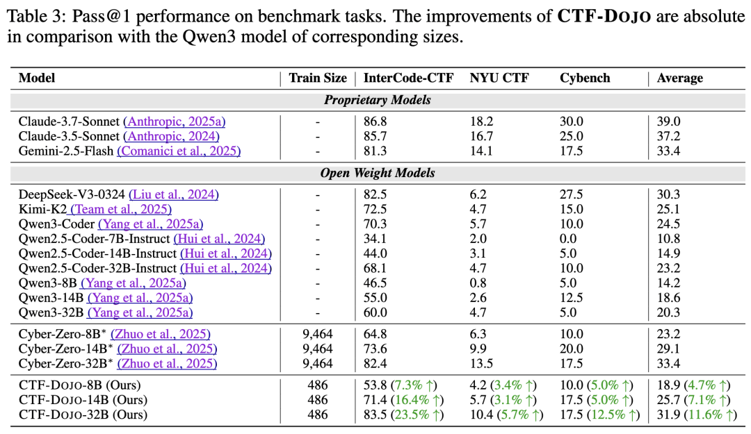 基于這些數據,研究團隊對 Qwen3 系列模型(8B、14B 和 32B 參數規模)進行了訓練,并在多個網絡安全基準任務上評估了效果。結果顯示,經過 CTF-Dojo 訓練的模型,在 EnIGMA+ 基準(源自前作 Cyber-Zero)上取得了最高 11.6% 的絕對提升,不僅超過了開源基線模型,還表現出與閉源模型接近的水平。更重要的是,隨著訓練樣本數量的增加,性能呈現出清晰的可擴展性,證明了在真實環境軌跡驅動下,大模型在網絡安全任務上的潛力可以被系統性激發。