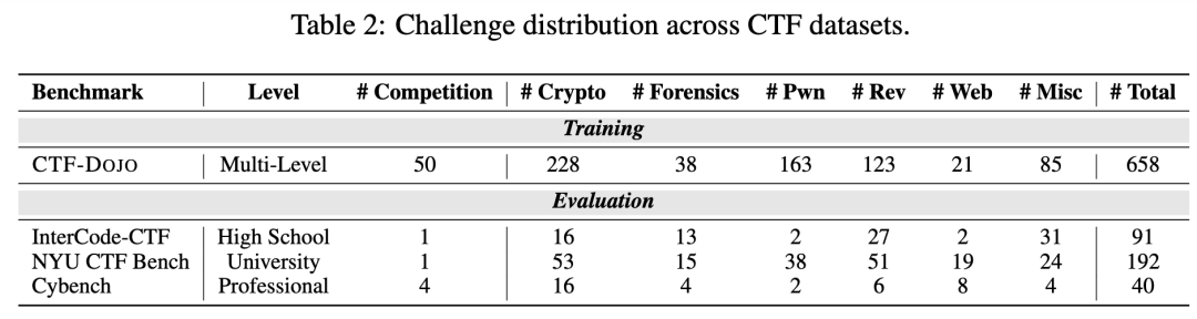 研究團隊選擇了全球最具代表性的 pwn.college CTF Archive 作為種子數據。該數據集收錄了數百個來自頂級賽事的高質量題目,涵蓋六大類別,從 Web 漏洞、二進制利用到密碼學挑戰一應俱全。通過精心篩選,并排除測試數據中已包含的題目,最終形成了 658 個獨立任務實例,為智能體訓練提供了堅實的基礎。
