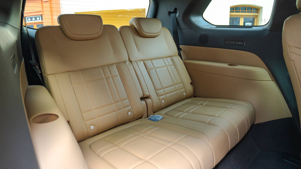 進入第三排,其實才是深藍S09與其他六座SUV真正出現(xiàn)差異化的地方。深藍S09的第三排可以有877mm的腿部空間,座椅也足夠?qū)挻笕彳洠耆珱]有坐小板凳的既視感。配合電動靠背調(diào)節(jié),身高170cm的成年人也完全可以在第三排葛優(yōu)躺,這使得第三排不再是應急之需,而是真正可以長時間乘坐的舒適座椅。另外第三排座椅也有扶手、杯架以及加熱功能等等,唯一的問題是第三排沒有頂棚拉手。