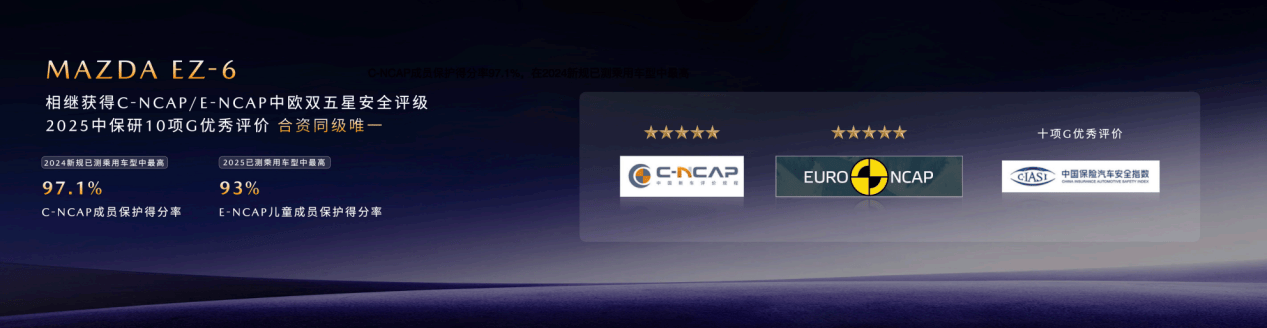 而在EZ-6車型方面,其自2024年10月以來,接連獲得Top Safety中國汽車極致安全巔峰挑戰認證和001號頂級安全證書、C-NCAP五星安全評級、中保研C-IASI“車內乘員安全指數”、“車外行人安全指數”、“車輛輔助安全指數”三大板塊10項G優秀評價、Euro NCAP五星認證且成為馬自達在歐洲市場成人乘員保護得分率最高的車型。