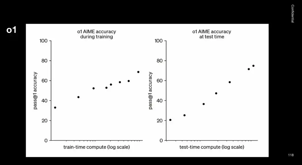 o1 的技術(shù)博客中展示了一張圖表:準(zhǔn)確度和測(cè)試時(shí)計(jì)算之間存在對(duì)數(shù)線性關(guān)系,o1 的性能隨著訓(xùn)練時(shí)間和測(cè)試時(shí)的計(jì)算而平穩(wěn)提高