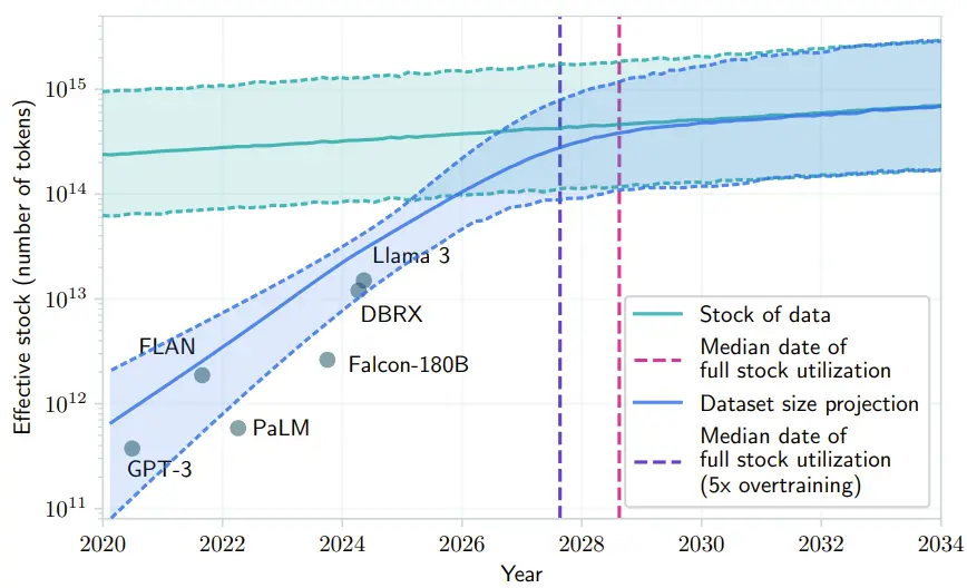 有研究預(yù)計(jì),如果 LLM 保持現(xiàn)在的發(fā)展勢(shì)頭,預(yù)計(jì)在 2028 年左右,已有的數(shù)據(jù)儲(chǔ)量將被全部利用完。屆時(shí),基于大數(shù)據(jù)的大模型的發(fā)展將可能放緩甚至陷入停滯。與此同時(shí),擁有版權(quán)、隱私等限制的數(shù)據(jù),更是加劇了垂直領(lǐng)域的發(fā)展。
