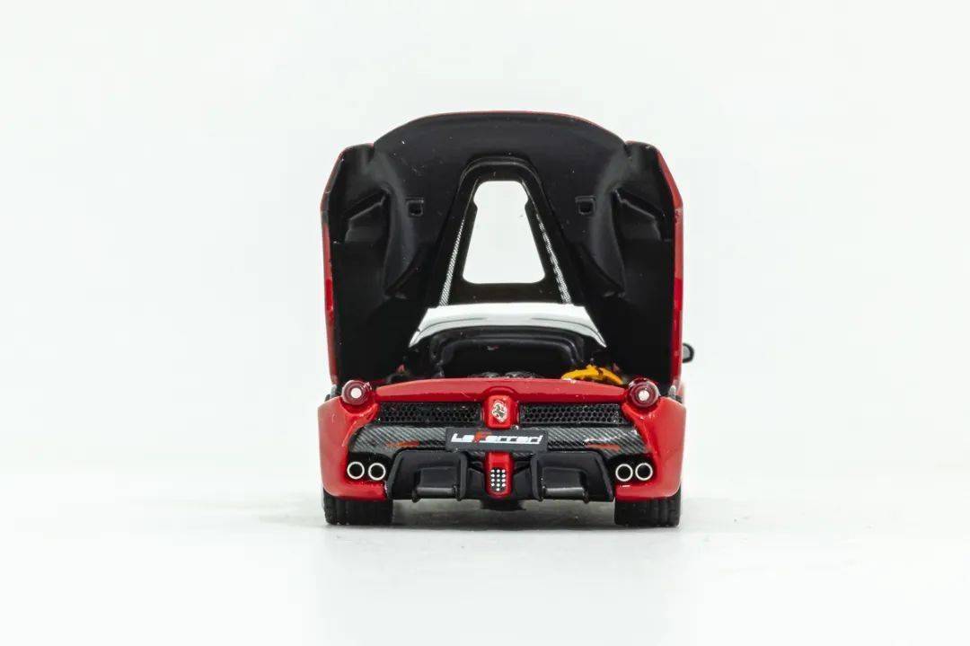 車尾的外形也沒大問題,通風口用了黑色的金屬網來刻畫,質感不錯,躍馬標也是蝕刻片的,車尾還有大面積的移印碳纖維;拉法尾燈外形比較獨特,模型用了獨立的塑料件,而低位剎車燈和中央警示燈(類似F1)都是移印的;尾部擴散器整體涂黑,排氣管是金屬材質的,質感不錯,但沒對齊,模型有刻畫后車牌架。