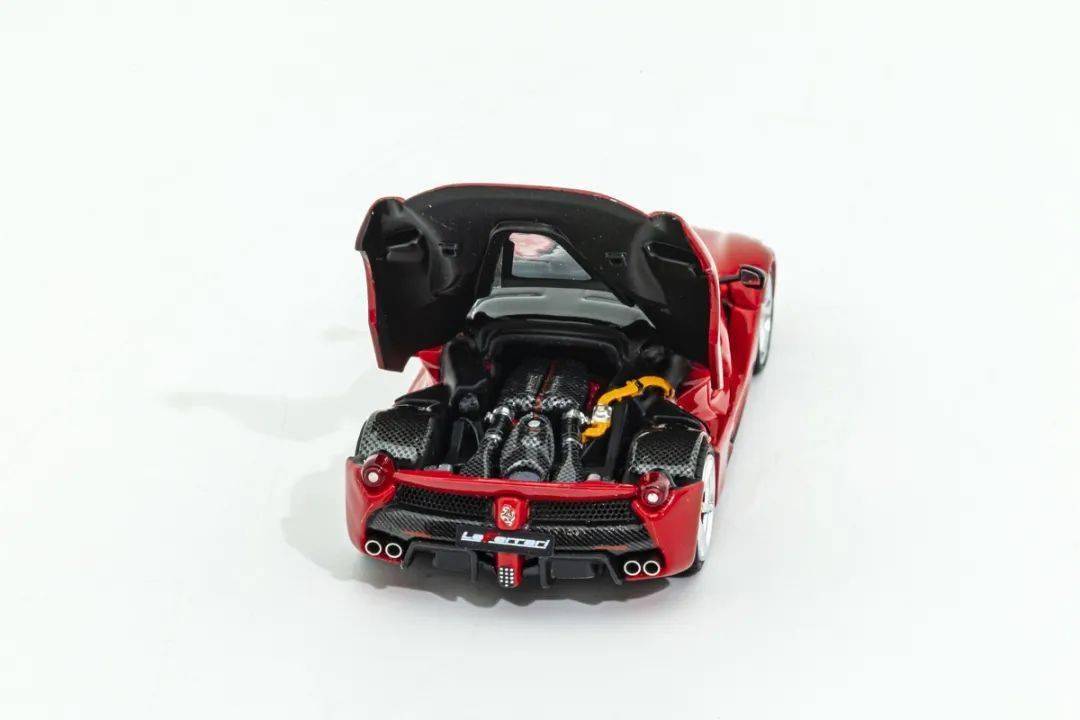 對比真車,雖然透視關系略有不同,但是整體形準還是很到位;拉法為中置引擎架構,車頭依然很長,其實這個和拉法設計參考F1有很大關系;紅色的素漆很符合法拉利的本質,漆面質感還是很好的;模型側面的各種通風口有些是真實鏤空的,有些是浮雕刻畫的,但看起還是很逼真的;側面的法拉利躍馬標應該是貼紙的,車窗邊框為黑色,車外后視鏡為獨立分件;前后蓋因為都是可分離設計,縫隙都稍顯大(真車也是有較明顯縫隙的);不過還是要說一下這款拉法有溢膠及各種漆面小瑕疵,品牌方還是要盡量提高品控。